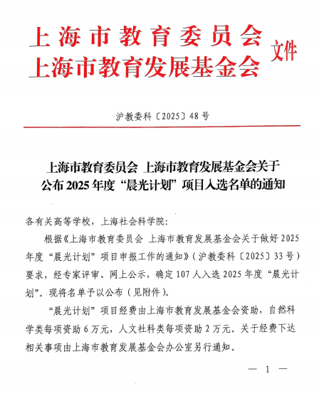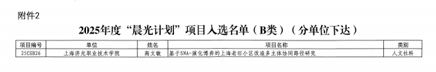 近日,上海市教育委员会、上海市教育发展基金会正式公布了2025年度“晨光计划”项目入选名单。我校城市空间数智学院高文敏老师申报的项目《基于SNA-演化博弈的上海老旧小区改造多主体协同路径研究》经多轮评审,成功入选。