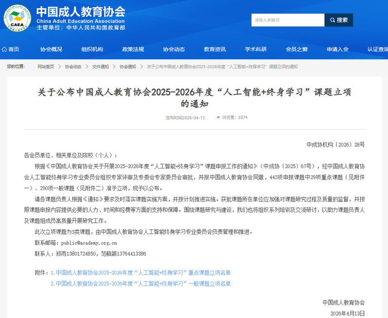 近日,中国成人教育协会正式公布了2025-2026年度“人工智能+终身学习”课题立项名单(中成协机构〔2026〕28号),我校成功获批1项重点课题及4项一般课题立项。